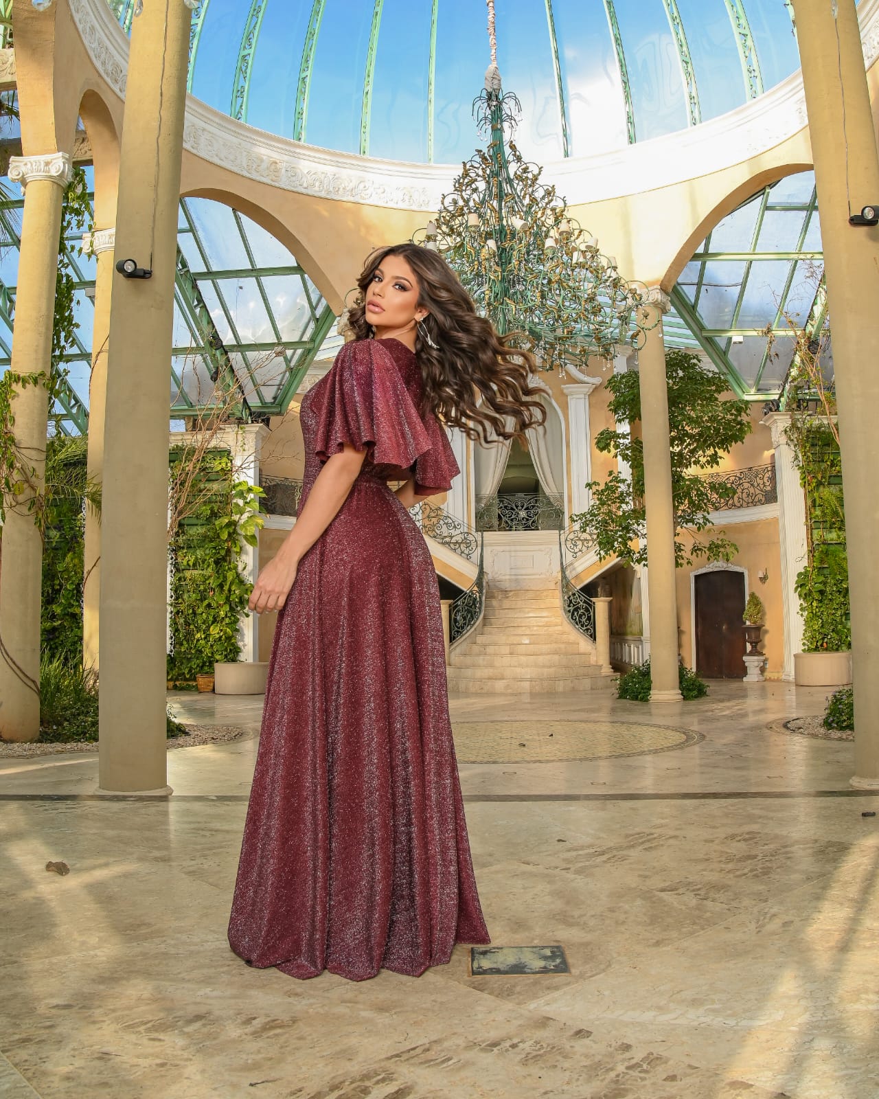 Vestido de festa longo, trabalhado em lurex, manga com detalhe no ombro, pala na cintura e elastec nas costas. Possui bojo, forro.