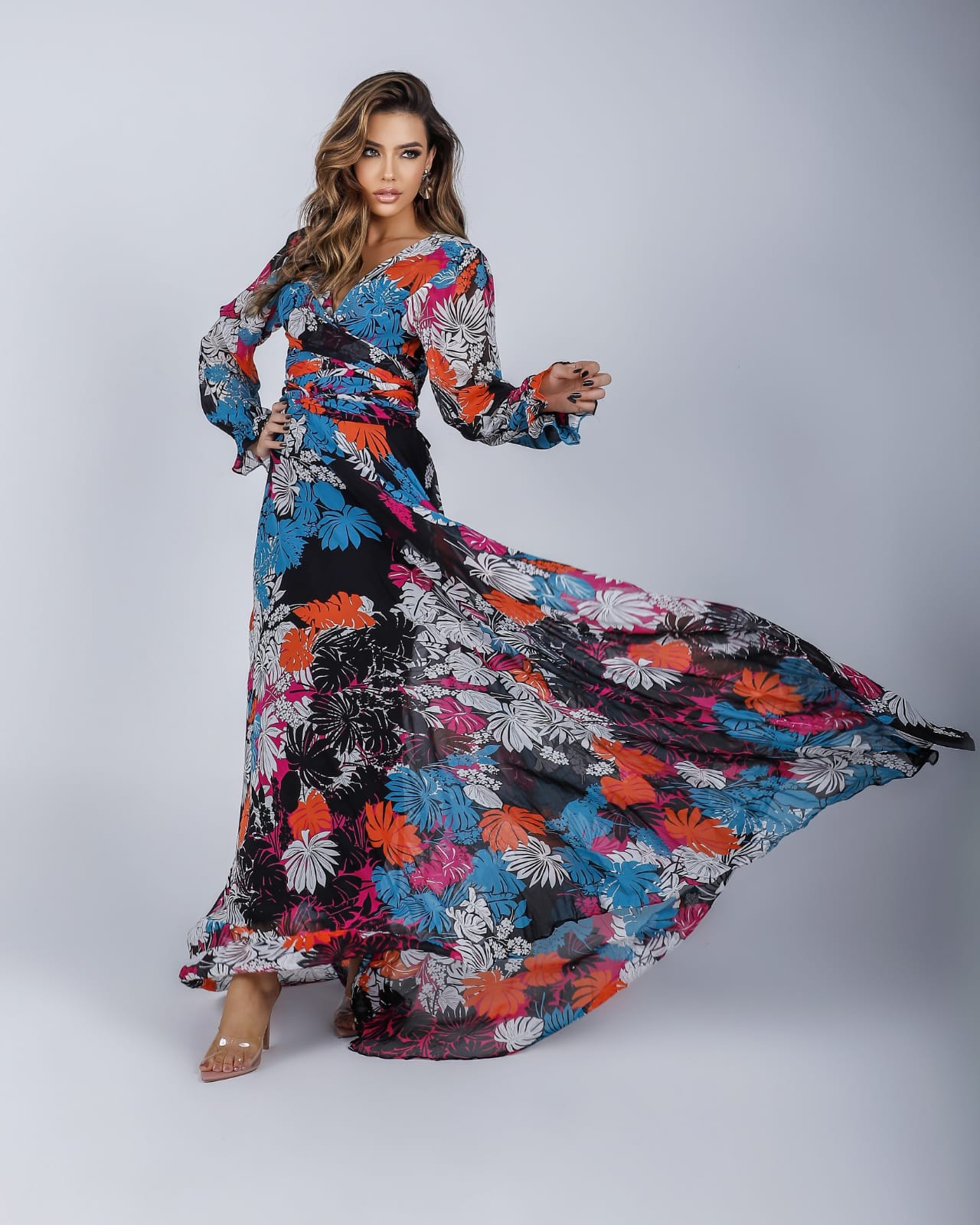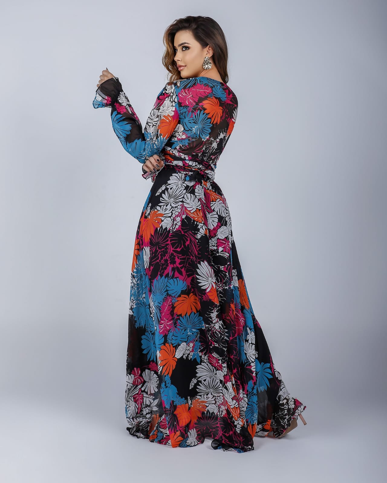Vestido floral,manga com elastico nos punhos e elastico na cintura. Possui uma fita para fazer a amarração no busto e cintura.