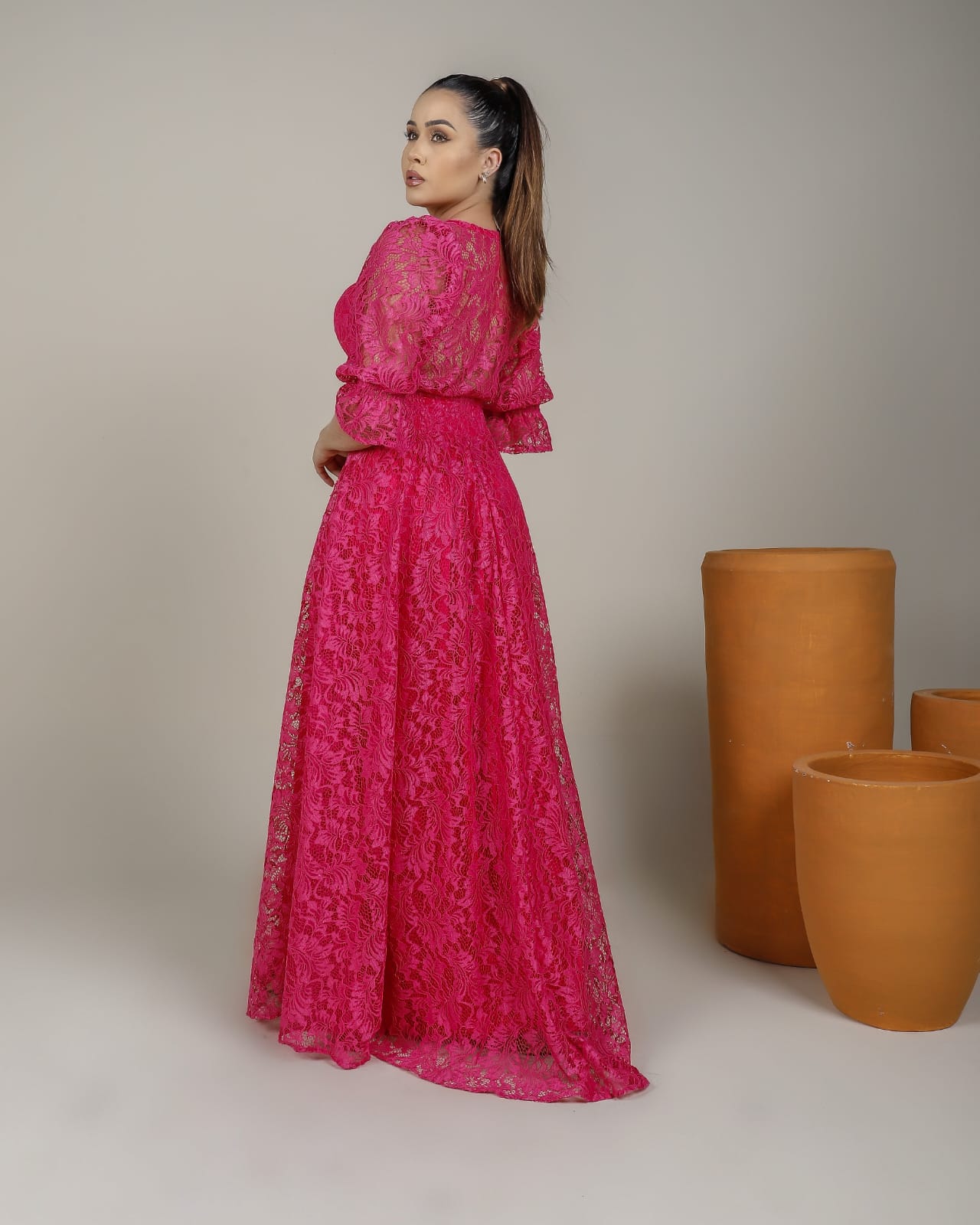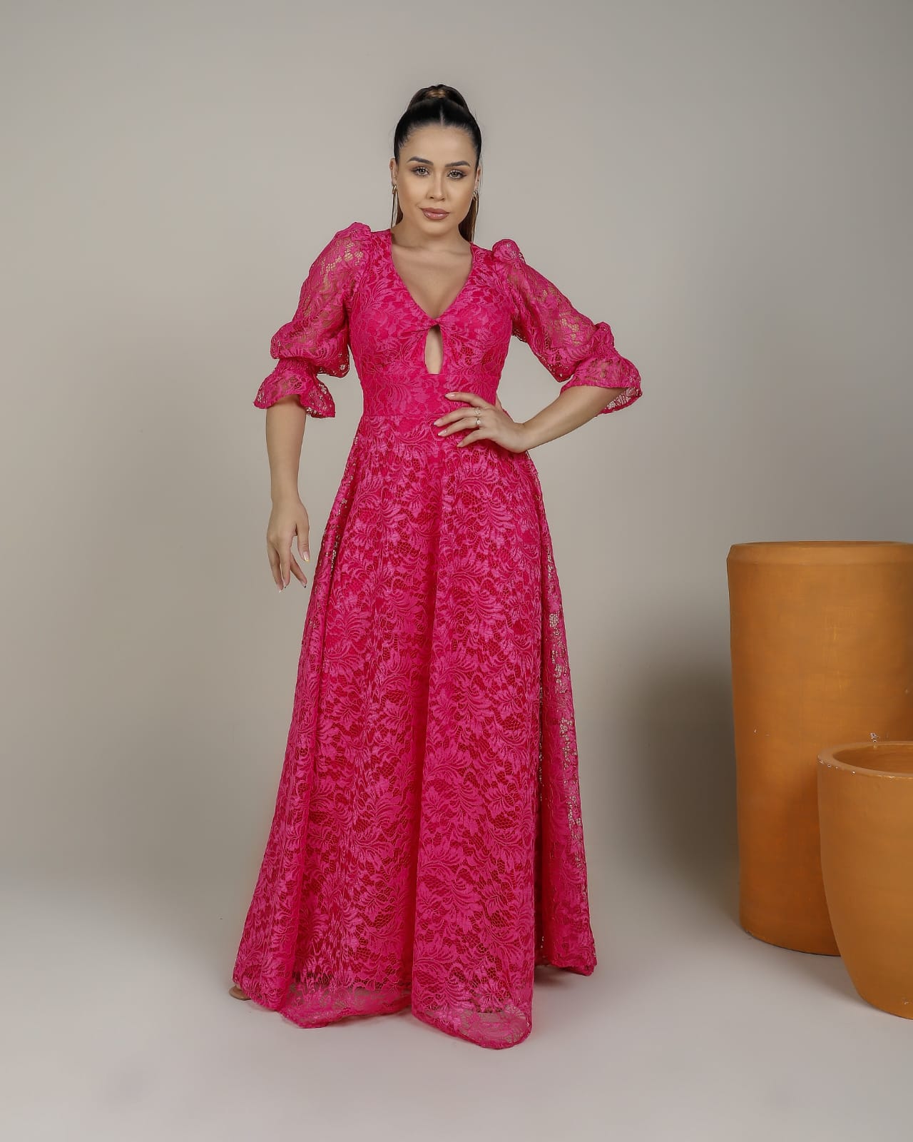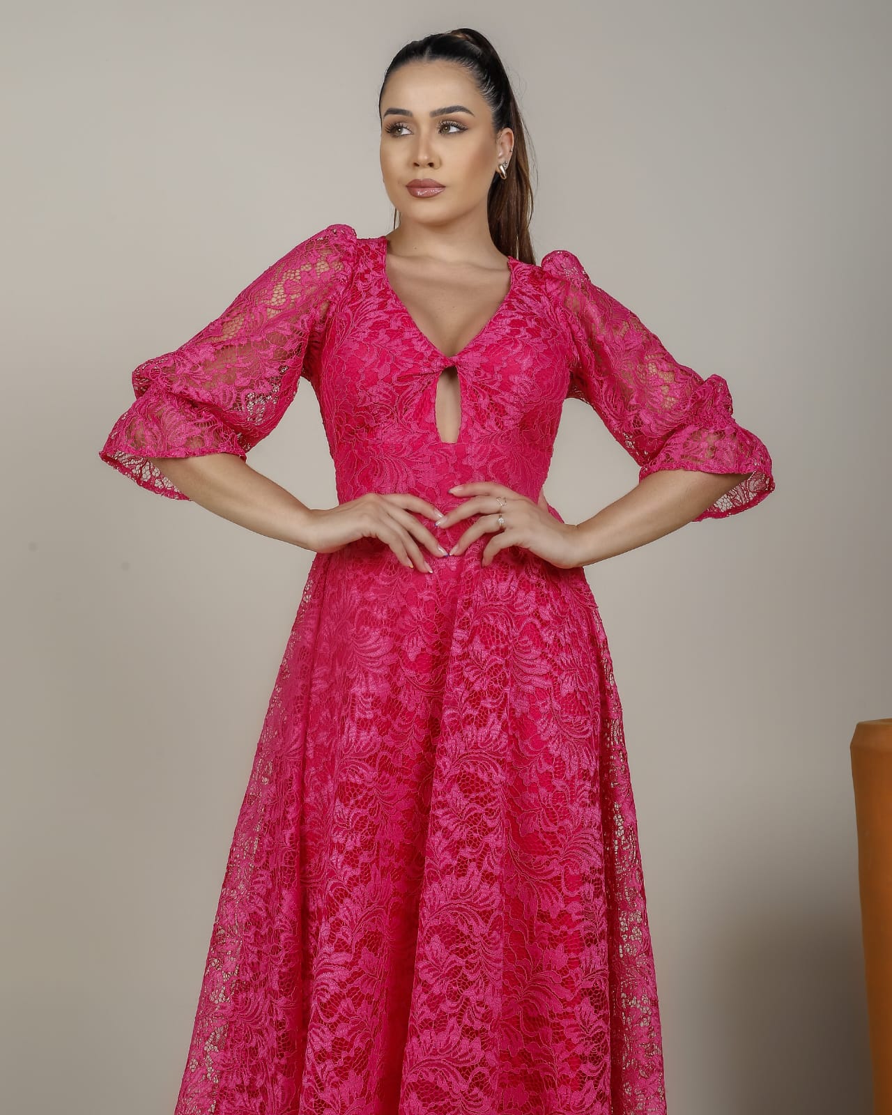 VESTIDO NO TECIDO RENDA 100% POLISTER, DETALHES DE ELASTICO NOS PUNHOS , E ELASTEC NAS COSTAS PARA MELHOR MODELAGEM, TODO FORRADO E POSSUI BOJO.