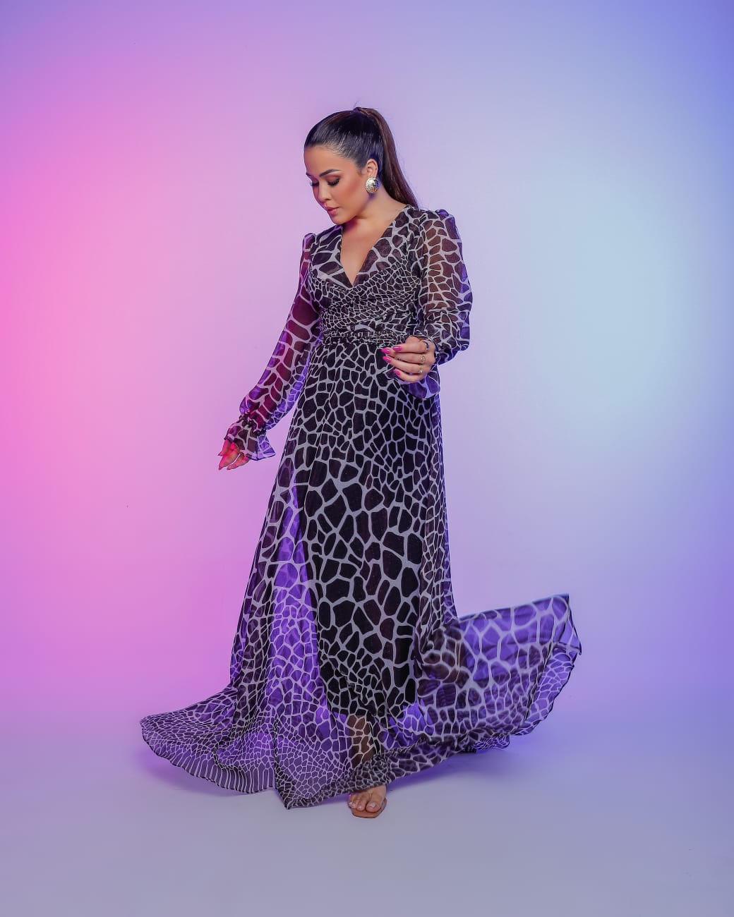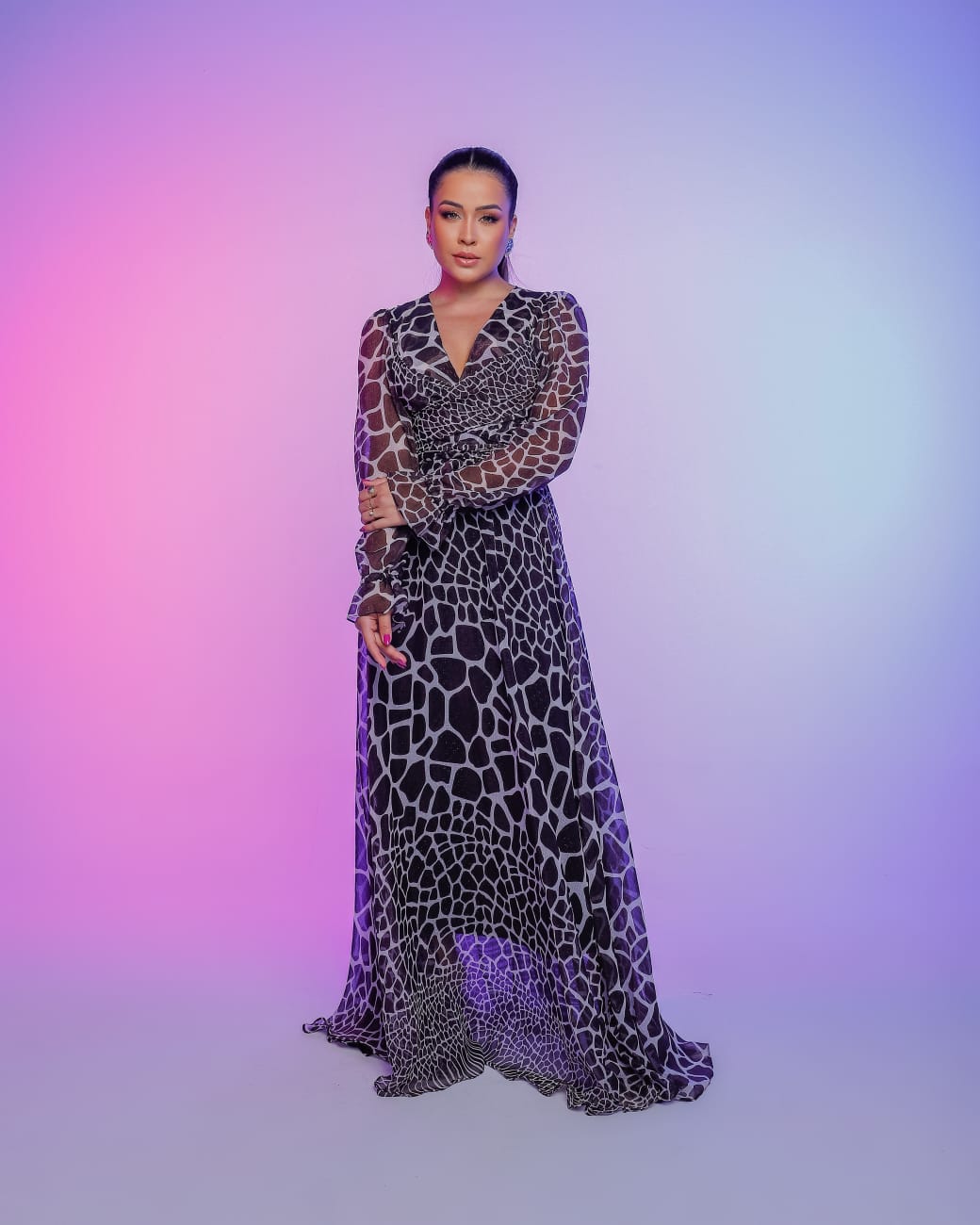 Vestido no tecido Musseline, 100% poliester,detalhes de elastico nos punhos e elastico na cintura para adaptar da melhor maneira ao corpo,detalhes do transpasse que pode ser ajustado na cintura amarrando e modelando. veste do 36 ao 44.